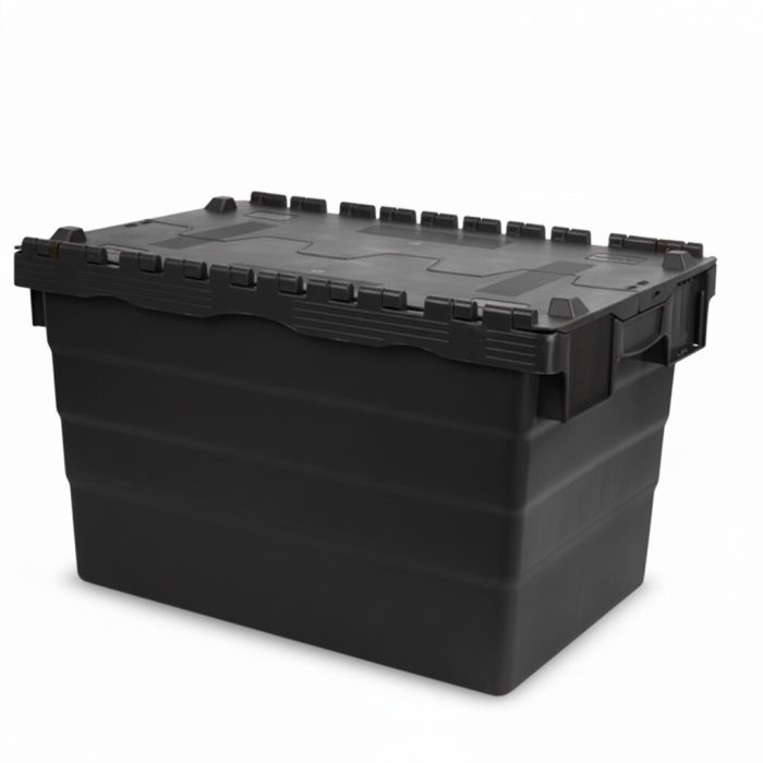 Kunststof distributiebak met tweedelige deksel – Zwarte logistieke stapel- en transportbak