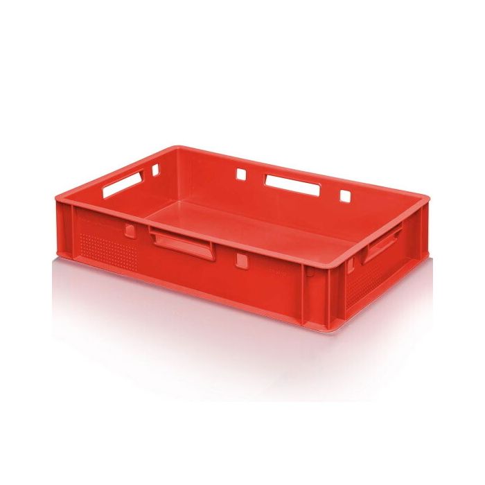 E1 vleeskratten van NORAH Plastics, voor het hygiënisch transporteren, wegen en opslaan van diverse vlees producten. De kratten worden conform DIN 55423-norm geproduceerd en komen hierdoor tegemoet aan de strenge eisen van het EHI. De vleeskratten E1, E2 en E3 zoals ook de pluimvee kratten E4 en E5 worden in de Europese vlees en pluimve eindustrie als poolkrat ingezet in een zogenoemde open-pool-systeem. In dit systeem koopt elke gebruiker, fabrikant of grossierderij zijn kratten naar eigen behoefte in. De kratten circuleren tussen de verschillende gebruikers en worden omgeruild bij levering. De kratten zijn fysiologisch gerust en 100% recyclebaar hierdoor goed voor het milieu. Uiterst stabiel op elkaar stapelbaar en compatibel met andere Euro-formaat stapelbakken, pallets, rolcontainers en transport dollies. Individuele opdruk zoals naam en logo zijn op aanvraag mogelijk – Geschikt voor verwerkende industrie, handel, retail, commerciële sectoren en horeca.