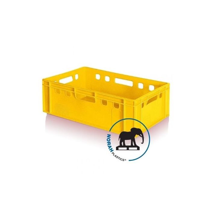 Gele productie krat voor het hygiënisch transporteren, wegen en opslaan van diverse vlees producten. De kratten worden conform DIN 55423-norm geproduceerd en komen hierdoor tegemoet aan de strenge eisen van het EHI. De vleeskratten E1, E2 en E3 zoals ook de pluimvee kratten E4 en E5 worden in de Europese vlees en pluimveeindustrie als poolkrat ingezet in een zogenoemde open-pool-systeem. In dit systeem koopt elke gebruiker, fabrikant of grossierderij zijn kratten naar eigen behoefte in. De kratten circuleren tussen de verschillende gebruikers en worden omgeruild bij levering. De kratten zijn fysiologisch gerust en 100% recyclebaar hierdoor goed voor het milieu. Uiterst stabiel op elkaar stapelbaar en compatibel met andere Euro-formaat stapelbakken, pallets, rolcontainers en transport dollies. Individuele opdruk zoals naam en logo zijn op aanvraag mogelijk – Geschikt voor verwerkende industrie, handel, retail, commerciële sectoren en horeca.