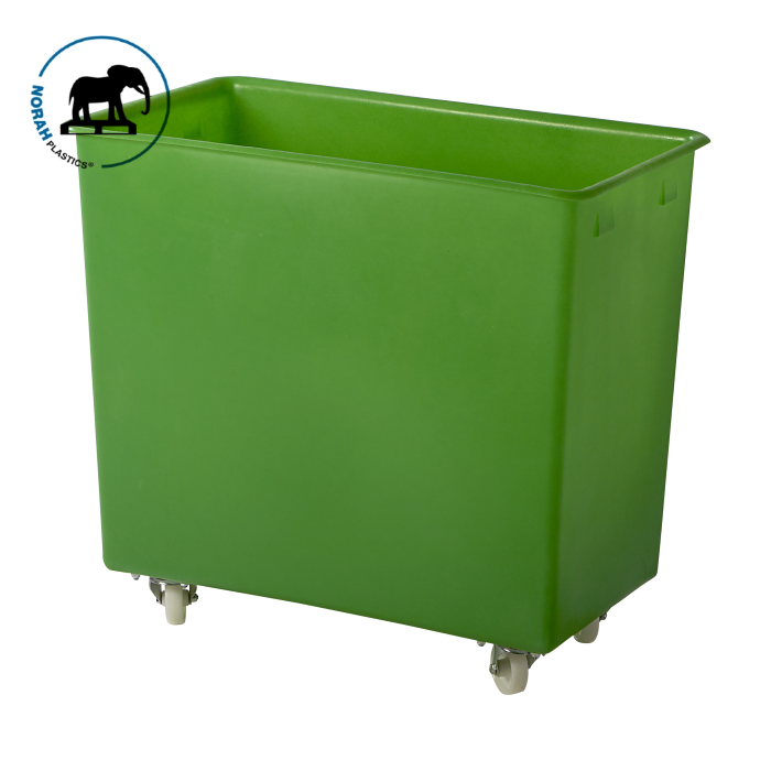 Robuuste kunststof transportwagens van NORAH Plastics voor universeel gebruik bij transport, opslag of productieprocessen. De verrijdbare bakken worden geproduceerd van eersteklas grondstof materiaal HDPE en worden uit één stuk gefabriceerd. Een stoot-, slagvaste constructie in een naad-, kierloos ontwerp met zowel buiten-, als binnenwerks rond en volledig gladde wanden, hierdoor zijn de bakken op wielen snel en grondig te reinigingen en uitermate gebruiksvriendelijk. Individuele opdruk zoals naam en logo zijn op aanvraag mogelijk – Geschikt voor poedervormig materialen, granulaat, onderdelen, wasgoed, grondstoffen, verpakkingen, levensmiddelen, afval en vloeistoffen; zoals Industrie, Handel, Retail, Commerciële sectoren, Horeca, Scholen, Gemeentes en Zorginstellingen.
