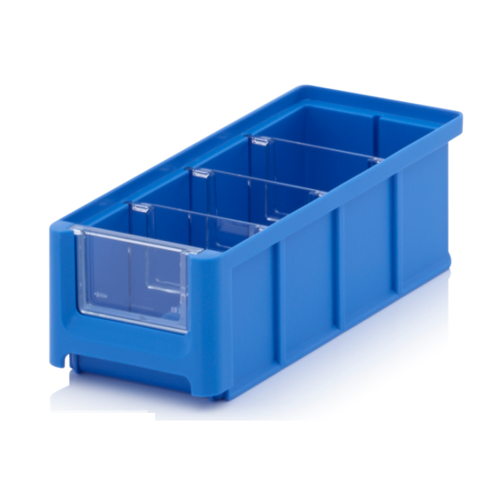 Magazijnbak 22x10,2x7,5cm, inhoud 1,08 liter met 3 dwarsverdeelschotten en insteekzichvenster
