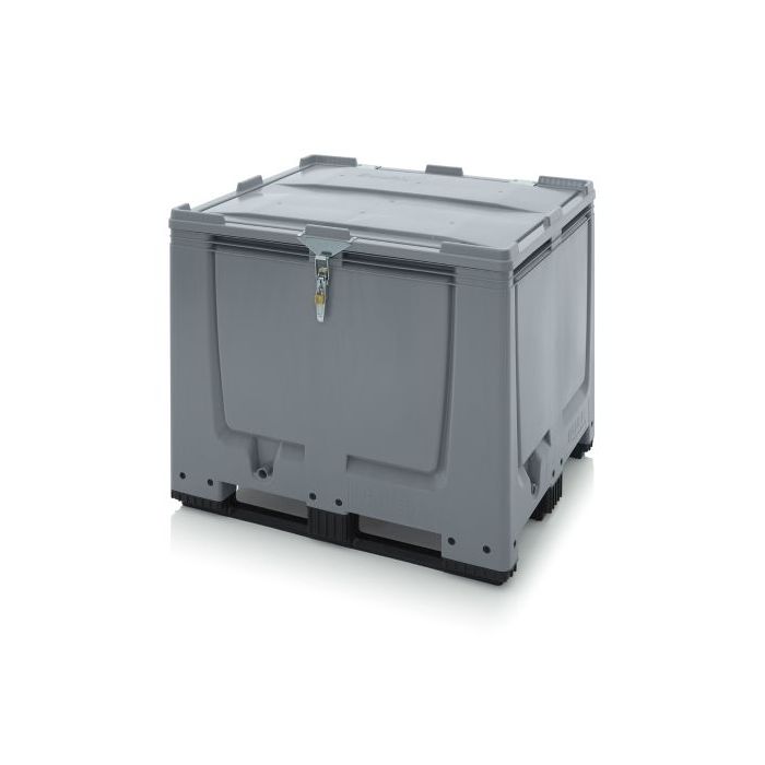 Bulk containers voor maximale capaciteit, uitgerust met een afsluitbare spansluiting, metaal beslag en een kunststof scharnierende deksel. De perfecte oplossing tijdens opslag of transport voor diefstal preventie en ongeoorloofd open van waardevolle of chemische producten. Een robuuste ontwerp gemaakt voor intensief dagelijks gebruik. De palletboxen worden geproduceerd uit voedingsgeschikt, stoot en slagvast HDPE materiaal wat een lange levensduur garandeert. Door de gladde binnen- en buitenwanden wordt reiniging een kinderspel. De palletboxen zijn leverbaar in diverse uitvoeringen zoals met 4 poten, 3 sleeplatten of op 4 wielen met scharnierdeksel, sleutelslot of tapkraan. De palletboxen zijn perfecte op elkaar stapelbaar en biedt een grote stapelstabiliteit aan. Uiterst toepasbaar in industriële omgevingenen verschillende werkomgevingen hierdoor geschikt voor toepassingen in de levensmiddelen en farmaceutische industrie of afvalmanagement. De afmetingen zijn conform de europese transport- en logistieksector hierdoor makkelijk in ieder gewenste bedrijfsprocessen te implementeren. Uiteraard zijn de palletboxen manoeuvreerbaar met handpallettruck of heftruck.