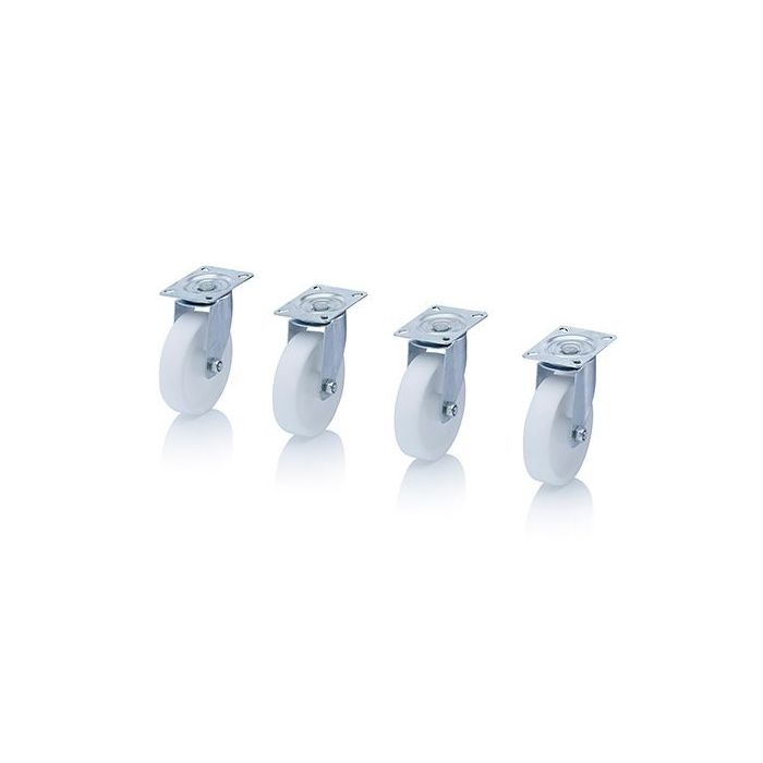 | Extra informatie | Set losse wielen voor zelf montage met gladde witte polyamiden nylon loopvlak, goed bestand tegen oliën, vetten en diverse chemicaliën. Materiaal is bijzonder slijtvast heeft een zeer lage rolweerstand en is slagvast en stoot bestendig |