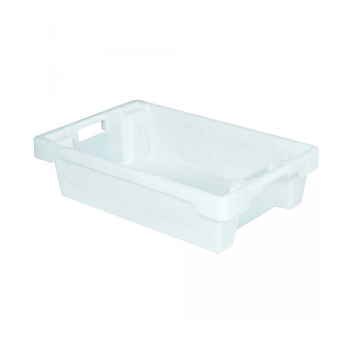 - Stapel-nestbare bak, hygiënisch wit, uitermate geschikt voor opslag-, transport en productie processen van levensmiddelen