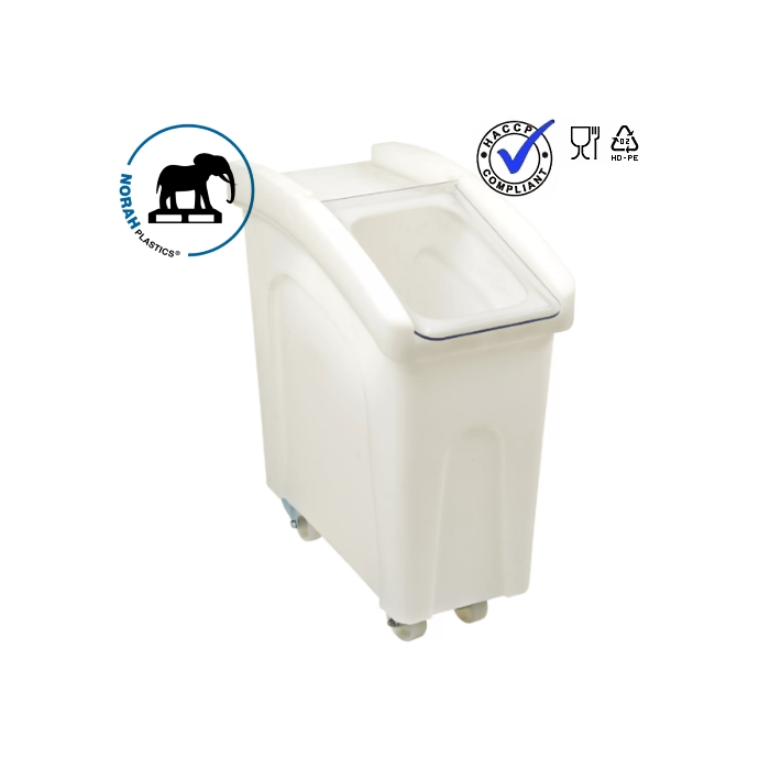 Ingrediëntenwagen met een transparante klapdeksel voor veilig en overzichtelijk opslag van uiteenlopende grondstoffen zoals: bloem, poeders, specerijen en kruiden. Een speciaal programma wat onze expertise weergeeft als toonaangevende specialist voor de bakkerijenindustrie en voedselproductie bedrijven. De grondstofwagens zijn zeer solide uitgevoerd, stootvast en dikwandig. Uitermate hygiënisch design, zowel buiten-, als binnenwerks rond en volledig glad afgewerkt, geen kieren, naden of randen dit voor optimale hygiëne - voedingskwaliteit. Met een transparante klepdeksel voor een snelle inhoud identificatie zorgt ervoor dat u de grondstoffen uit de bak kan scheppen en weer eenvoudig kan afsluiten – Geschikt voor uitlopende grondstoffen, van meel, kruiden of specerijen tot poedervormig materialen en granulaat.