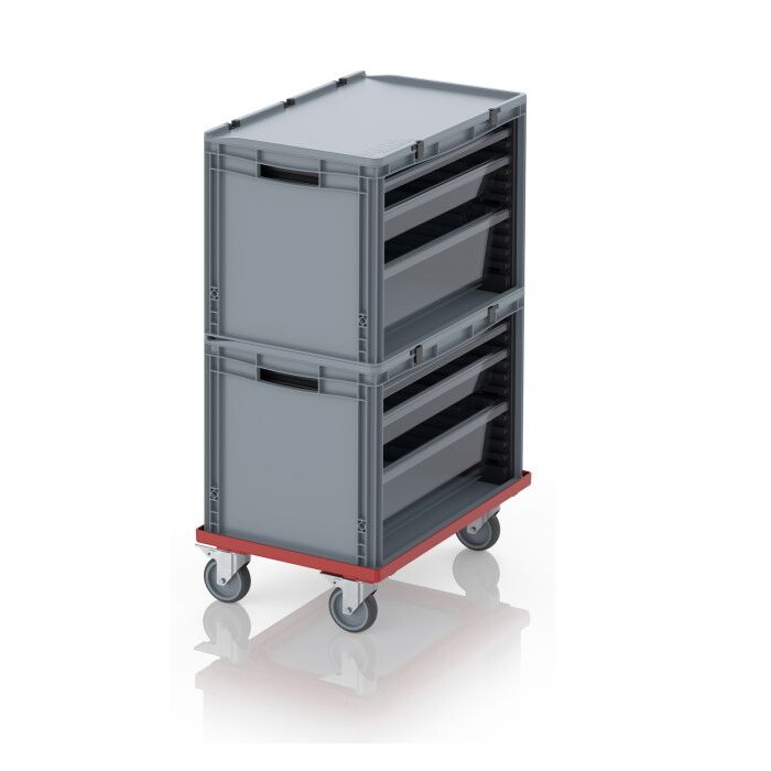 | Extra informatie | Samengesteld uit: 2x scharnierdeksels, 2x losse stapelbare omkastingen, 4x inschuifsleuven voor 6 opnames, 2x nestbakken afm: 53x36x2cm, 2x nestbakken afm: 53x36x8,5cm, 2x nestbakken afm: 53x36x17,5cm en 1x transport onderstel |